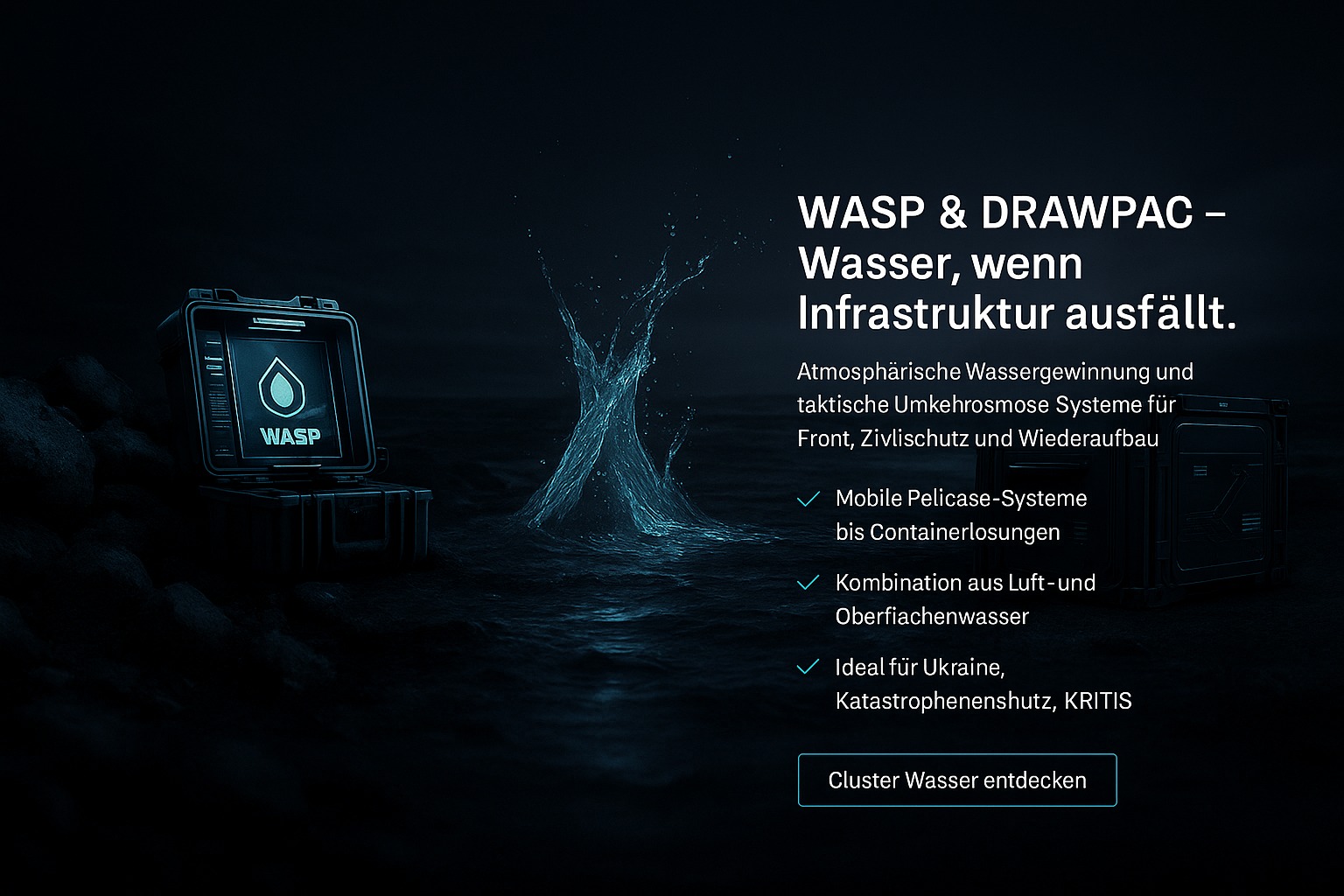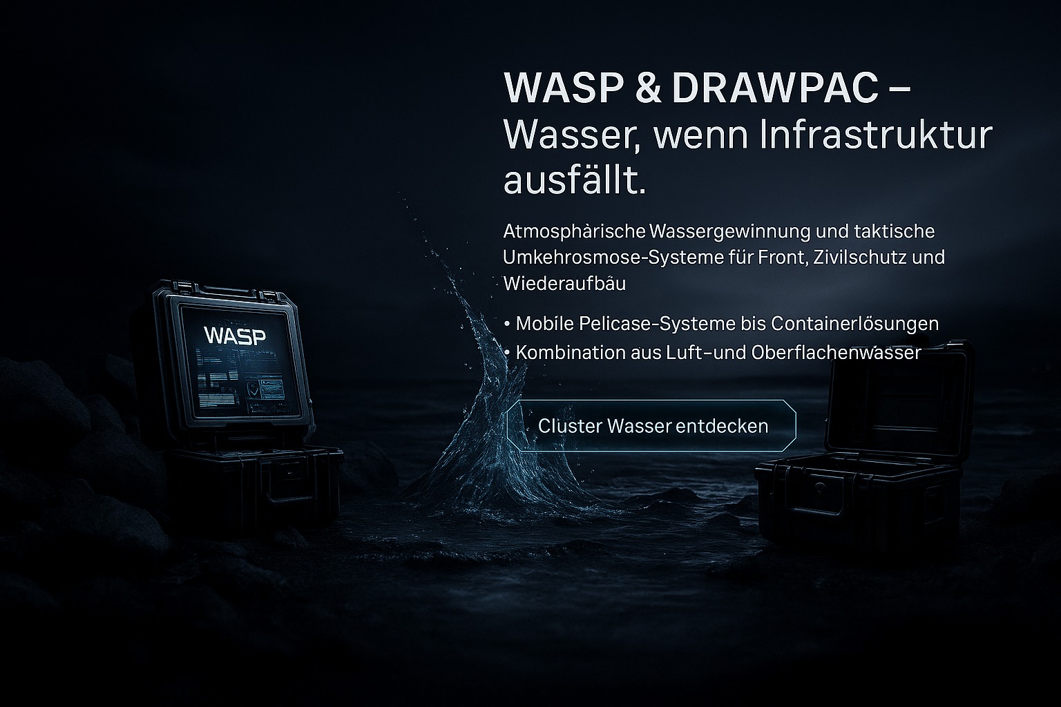 DRAWPAC ist die taktisch optimierte Wasseraufbereitungsfamilie von EuroDH für Meer-, Brack- und Oberflächenwasser. Die Produktlinie reicht von tragbaren Koffersystemen über paletten fähige Einheiten bis hin zu leistungsstarken 20-oder 40-Fuß-Containeranlagen. Kern der Technologie ist eine robust ausgelegte Umkehrosmose mit vorgeschalteter Mehrstufenfiltration, ausgelegt für raueste Einsatzbedingungen. DRAWPAC schließt die Lücke zwischen Outdoor-Freizeitgeräten und schwerfälligen Industrieanlagen, indem es militärische und zivile Anforderungen zusammenführt. Je nach Konfiguration lassen sich Hunderte bis zehntausende Liter Trinkwasser pro Tag bereitstellen. Die Systeme sind modular erweiterbar, lassen sich mit eigener Energieversorgung koppeln und in bestehende Infrastrukturen einbinden. DRAWPAC ist klar strukturiert nach Military-, BOS- und Zivilschutzlinien und eignet sich dadurch für nationale und internationale Förderprogramme. Zusammen mit WASP entsteht eine robuste, skalierbare Wasserarchitektur, die sowohl Front- als auch Hinterlandversorgung absichern kann.