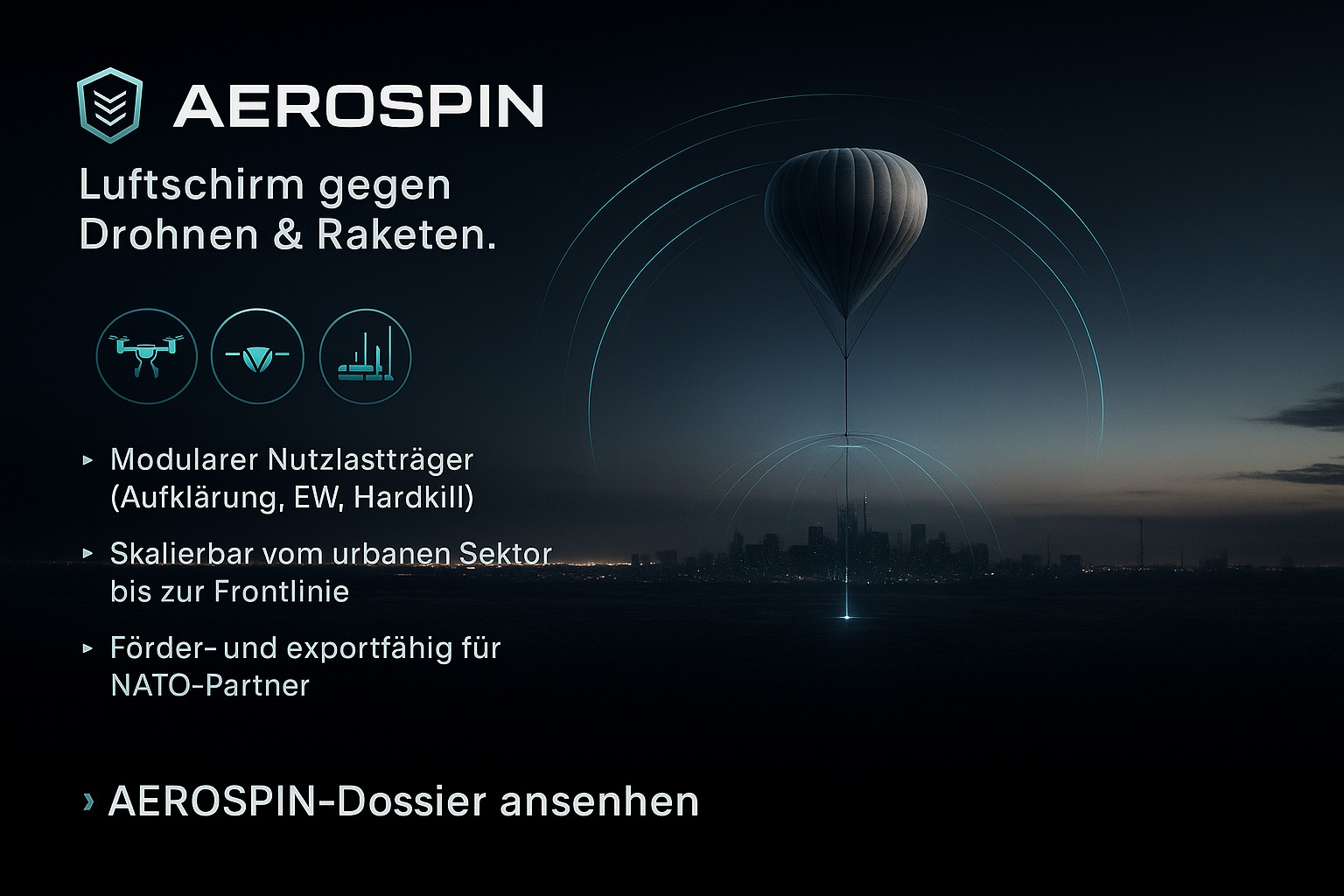 AEROSPIN ist das ballon- und stratosphärenbasierte Schutzsystem von EuroDH, das einen dauerhaften „Schutzschirm“ über Städten, Frontabschnitten und kritischer Infrastruktur aufspannt. Je nach Konfiguration deckt ein System vom urbanen Luftraum bis hin zu zehntausenden Quadratkilometern Luftraum ab. Durch modulare Nutzlasten können Aufklärung, elektronische Kampfführung, Täuschung und aktive Drohnenabwehr in einem einzigen System gebündelt werden. Die Trägerplattform arbeitet energieeffizient, ist wieder verwendbar und dadurch deutlich günstiger im Betrieb als klassische Flugabwehrsysteme oder bemannte Luftfahrzeuge. AEROSPIN ist als militärische Systemfamilie mit unterschiedlichen Tragklassenausgelegt und lässt sich an nationale Bedrohungslagen und Budgetrahmenanpassen. Über standardisierte Schnittstellen ist das System direkt in Führungs- und Einsatzsysteme integrierbar und liefert verwertbare Lagebilder in Echtzeit. Für Nutzer entsteht damit eine neue Fähigkeitsschicht zwischen klassischer bodengebundener Luftverteidigung und hochpreisigen Luftplattformen. AEROSPIN wird konsequent als export- und förderfähiges Schlüsselprojekt positioniert und ermöglicht Partnern, ihre Luftverteidigung qualitativ aufzurüsten, ohne ihrekomplette Systemlandschaft zu erneuern.